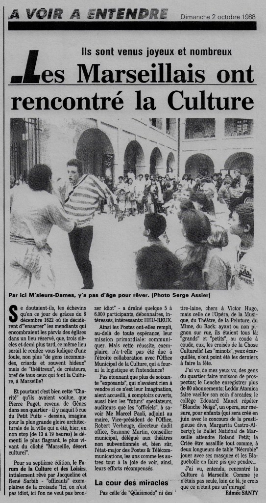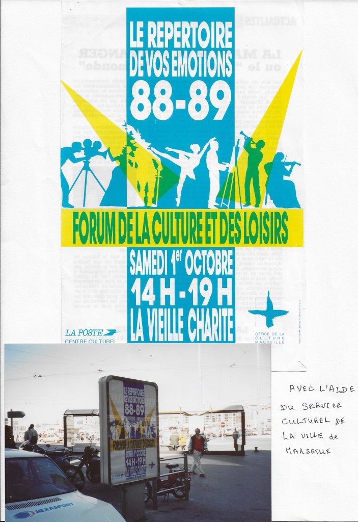 Ce fut le point de départ de la création du « Forum des Loisirs et de la Culture » qui rassemblait à l’automne 1988, les structures culturelles de la ville. Le service Culturel de la ville, intéressé par notre initiative, nous demanda de le proposer au niveau de la ville et nous accorda le site de la Vieille Charité, qui eut droit à la presse marseillaise, grandes affiches dans les rues …..